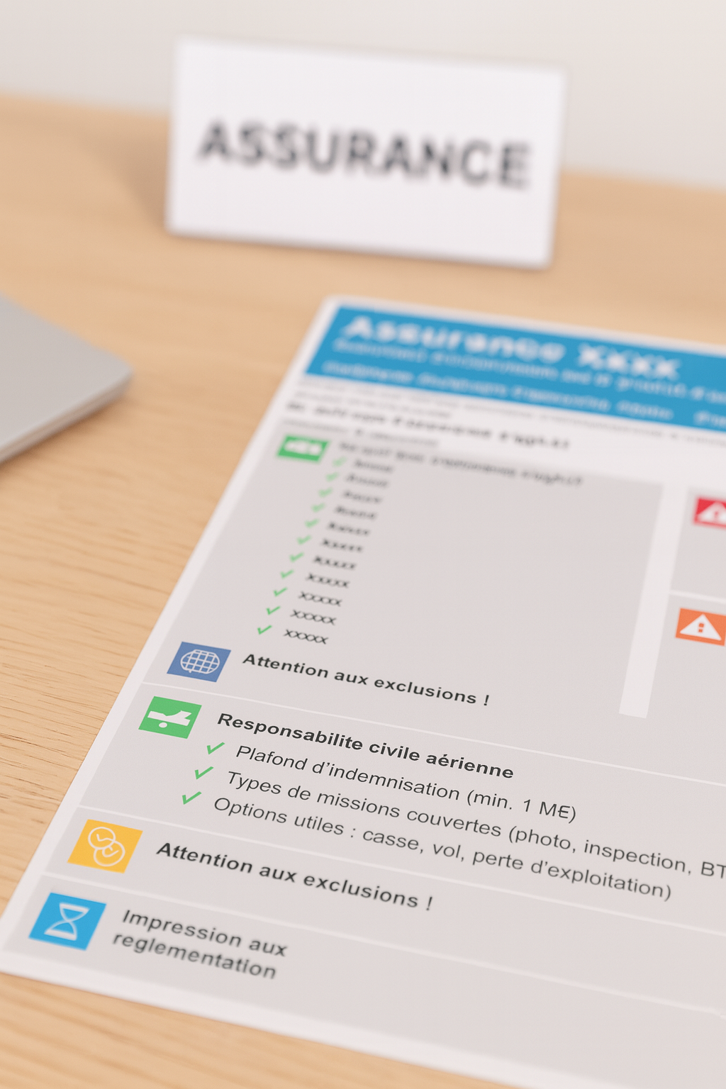- Les options utiles : couverture du drone en cas de casse, vol, perte d’exploitation, protection juridique.